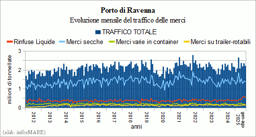 In the first eight months of 2025, the port of Ravenna handled a total of 17.91 million tons of cargo, with an increase of +6.0% over the same period last year, of which 16.88 million tonnes of liquid bulk (+16.9%), 7.57 million tonnes of dry bulk (+10.9%), 3.92 million tonnes of dry bulk cargo tonnes of conventional goods (-5.9%), 1.59 million tonnes of tons of containerized cargo (+4.3%) with a of containers equal to 144 thousand TEUs (+4.5%) and 1.09 million tons of rolling stock (-7.5%). In the cruise sector, traffic is 187 thousand passengers (-3.4%).