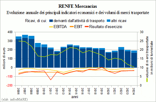 In 2024, goods transported by rail by Spain's RENFE Mercancías fell by -12.0%