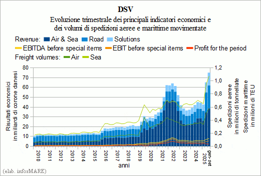 Nel terzo trimestre di quest'anno, sulla scia degli effetti dell'acquisizione della tedesca Schenker completata la scorsa primavera ( del 30 aprile 2025), il gruppo logistico danese DSV ha registrato nuovamente ricavi trimestrali record che sono ammontati a 71,98 miliardi di corone danesi (9,6 miliardi di euro), in forte crescita del +63,2% sullo stesso periodo del 2024, grazie ad un volume d'affari record segnato dal segmento delle spedizioni stradali, che è risultato pari a 23,42 miliardi di corone (+135,0%), e dal segmento della contract logistics, che è ammontato a 13,11 miliardi (+98,1%). Sono aumentati anche i ricavi generati dai settori delle spedizioni aeree e marittime che si sono attestati rispettivamente a 21,08 miliardi (+50,0%) e 17,61 miliardi di corone (+22,6%), settori in cui i volumi di merci movimentate hanno raggiunto le quote record rispettivamente di 579mila tonnellate (+64,4%) e 1,07 milioni di container teu (+52,3%).