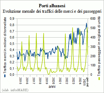 Nel terzo trimestre di quest'anno i porti albanesi hanno segnato nuovi record storici di traffico sia delle merci che dei passeggeri grazie a flussi mai così consistenti registrati nei mesi dell'estate appena trascorsa. Nel solo settore delle merci il periodo luglio-settembre del 2025 è stato archiviato con un totale di 2,25 milioni di tonnellate di carichi, con una progressione del +16,7% sul terzo trimestre del 2024, di cui oltre 2,13 milioni di tonnellate movimentate dal solo porto di Durazzo (+17,4%). Il nuovo picco storico trimestrale è stato raggiunto grazie al record mensile assoluto totalizzato lo scorso mese di agosto con 832mila tonnellate nonché ai volumi movimentati negli scorsi mesi di agosto e settembre i cui livelli sono risultati rispettivamente il sesto e il nono più elevati di sempre.