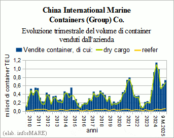 Nel secondo trimestre di quest'anno è proseguita la flessione dei risultati finanziari e commerciali della cinese China International Marine Containers (Group) Co. (CIMC) iniziata nel trimestre precedente e determinata dal raffronto con gli stessi periodi del 2024 quando le performance avevano raggiunto picchi storici sulla scia della forte domanda di container intermodali prodotti dall'azienda. Nel periodo luglio-settembre di quest'anno le vendite di contenitori della CIMC hanno segnato una flessione del -36,0% causata dalla riduzione delle vendite di container per carichi secchi che sono risultate pari a 676mila teu (-38,8%), mentre le vendite di container reefer sono continuate a crescere essendo state pari ad oltre 61mila teu (+26,3%).