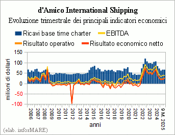 Également au troisième trimestre de cette année, comme au cours des quatre trimestres précédents, la société d’Amico International Shipping (DIS), qui opère dans le segment des camions-citernes Handysize, MR et LR1 par l’intermédiaire de l’entreprise dans leur intégralité d’Amico Tankers, a enregistré une aggravation de résultats financiers. Au cours de la période juillet-septembre 2025, les revenus L’affrètement à temps de base s’élevait à 66,8 millions de dollars, avec un Baisse de -20,5 % par rapport au même trimestre de l’année dernière. EBITDA et L’EBIT s’élève respectivement à 39,2 M€ (-32,1 %) et 26,7 M€ millions de dollars (-38,4 %). Bénéfice net de 24,3 millions (-39,6 %).