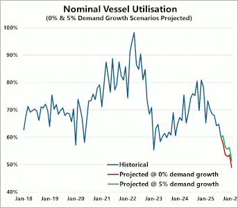 Das singapurische Unternehmen spezifiziert, dass auf der Grundlage einer 80%igen Korrelation zwischen Nutzung und Spotfrachtraten, Prognose zeigt Rückgang der Frachtraten im negativen Bereich und stellte fest, dass die Frachtraten zwar nicht negativ wird, deutet der Trend darauf hin, dass der Markt dazu bestimmt ist, sich so zu verschlechtern, dass die gezwungen sein, einen erheblichen Teil der Halten Sie die Kapazität zurück, um ein größeres Gleichgewicht wiederherzustellen. Laut Sea-Intelligence sind daher Reeder, die in Dieser Markt sollte sich darauf vorbereiten, die hohe Die Wahrscheinlichkeit, dass viele planmäßige Schiffsabfahrten in der Monate müssen storniert werden.