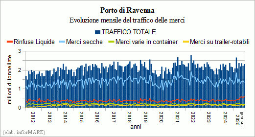 En los primeros nueve meses de este año, el tráfico total de carga en el puerto de Rávena fue de 20,23 millones de toneladas, un +7,3% más que en el mismo periodo de 2024.