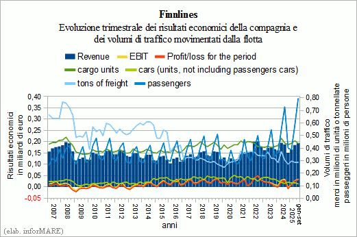 Im dritten Quartal dieses Jahres hat der Umsatz des Unternehmens Finnische Schifffahrt Finnlines der italienischen Reedereigruppe Grimaldi belief sich auf 195,2 Mio. € und stieg damit um +3,2 % gegenüber dem gleichen Zeitraum des Jahres 2024 gegenüber den operativen Kosten stabil bei 161,1 Mio. € (-0,4 %). Die Werte sowohl des EBITDA und des operativen Ergebnisses, die Ergebnis von 57,1 Mio. € bzw. 34,5 Mio. € Euro. Der Nettogewinn belief sich auf 32,1 Mio. € (+15,1 %).