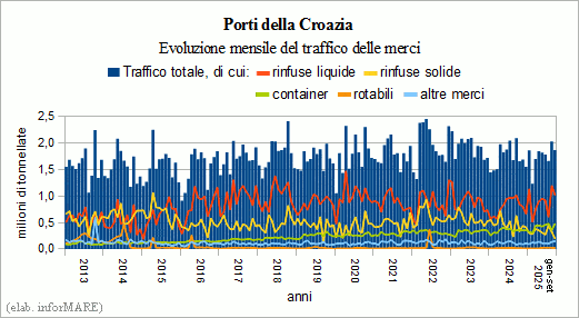 Au troisième trimestre de cette année, les ports croates 5,57 millions de tonnes de marchandises traitées, soit une diminution de -4,4 % sur la même période de 2024, dont 4,24 millions tonnes de fret au déchargement (-4,9 %) et 1,32 million tonnes à l’embarquement (-3,0 %). La réduction globale des a été déterminé par la diminution des volumes le vrac liquide et le vrac solide qui se sont révélés être respectivement à 2,83 millions de tonnes (-4,0 %) et 966 mille tonnes (-30,5 %). Les marchandises conteneurisées connaissent une forte croissance avec 1,31 million de tonnes (+22,1 %) réalisées avec un manutention de conteneurs équivalant à 144 484 EVP (+18,2 %), soit tels que le matériel roulant avec 71 mille tonnes (+22,7 %) et d’autres marchandises divers avec 386 mille tonnes (+9,3 %).