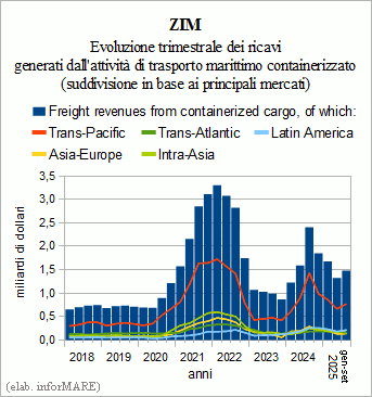 En particulier, le plus grand volume de trafic, le sur les routes transpacifiques, se résumait à 414 000 EVP (-1,7 %) et les revenus générés sur ce marché étaient s’élevait à 767,5 millions de dollars (-46,2 %). Les conteneurs transporté par les services intra-asiatiques de la société israélienne s’élevait à 195 000 EVP (+4,3 %) et les revenus associés étaient équivalent à 208,3 millions de dollars (-16,1 %). Sur les routes avec l’Amérique Le trafic latin était de 133 000 EVP (+2,3 %) et L’entreprise a généré des revenus de 214,0 millions de dollars (-16,8%). Les services transatlantiques de ZIM transportés 113 000 EVP (-19,3 %) et les revenus associés s’élevaient à 157,0 un million de dollars (-13,7 %). Enfin, sur les routes Asie-Europe - marché le plus touché par l’effet de la crise en mer Rouge, ce qui a forcé la plupart des porte-avions maritimes pour éviter les transits par le canal de Suez et il fut constaté être le moins satisfaisant pour le ZIM - le trafic géré était de 71 000 EVP (-22,8 %) et les revenus en Ce marché s’élevait à 136,2 millions de dollars (-53,0 %).