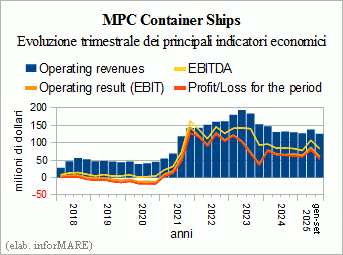 La société norvégienne MPC Container Ships (MPCC), une entreprise qui à la Le 30 septembre 2014, elle possédait une flotte de 51 porte-conteneurs d’une capacité totale de 129 000 EVP, possède clôturé la période juillet-septembre de cette année avec des revenus égaux à 125,9 millions de dollars, en baisse de -5,0 % par rapport au troisième trimestre de 2024, à la fin de laquelle la flotte de la société a été créée par 56 navires pour une capacité de cale de 128 000 EVP. Le L’EBITDA s’est élevé à 83,5 millions d’euros (-1,6 %), celle du bénéfice d’exploitation à 60,4 millions d’euros (-7,7 %) et le Valeur du bénéfice net à 53,6 millions de dollars (-15,8 %).