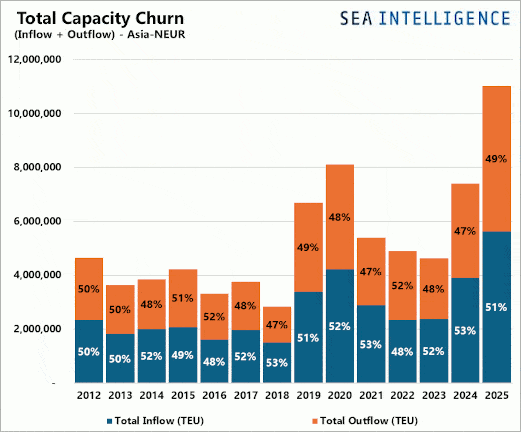Sea-Intelligence ha evidenziato che i dati per il 2025 indicano un significativo cambiamento strutturale, con le compagnie che sono passate da un impiego stabile delle portacontainer ad un modello di adeguamento della capacità di elevata frequenza. La società ha rilevato che questo trend è risultato più pronunciato relativamente alla rotta Asia-Nord Europa, dove nel 2025 il ritiro della capacità di stiva ha raggiunto quota 11,0 milioni di container teu rispetto ad una media storica di 3-5 milioni di teu registrata tra il 2012 e il 2019. Il dato del 2025 risulta superiore del +138% rispetto al 2023, ad indicare - ha spiegato la società - che i carrier stanno attivamente immettendo e ritirando tonnellaggio ad un ritmo mai verificatosi in precedenza.