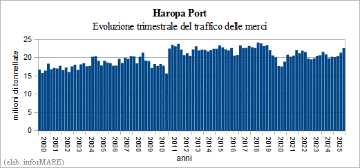 En 2025, el tráfico de mercancías gestionado por el sistema Puerto de Haropa, formado por los puertos de Le Havre, Ruan y París, fue de 84,7 millones de toneladas, un aumento del +2,0% del año anterior. El tráfico de contenedores era igual a 30,5 millones de toneladas (+2,1%) y la manipulación de alcanzó un nuevo máximo histórico de 3,2 millones TEU (+4,0%). Los volúmenes de carga seca a granel que totalizó 12,9 millones de toneladas (+10,0%), mientras que La carga líquida a granel se mantuvo estable en 39,7 millones de toneladas (-0,7%). En el sector de cruceros, el El tráfico disminuyó un -7,0% hasta 476.205 pasajeros.