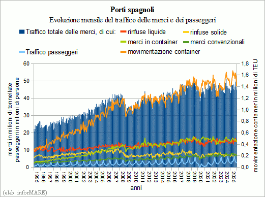 Nel solo quarto trimestre del 2025 i porti spagnoli hanno movimentato un totale di 140,9 milioni di tonnellate di merci, con una progressione del +4,2% sullo stesso periodo dell'anno precedente. Nel comparto delle merci containerizzate sono state movimentate 46,5 milioni di tonnellate (+0,4%), traffico che in termini di container da 20' è stato pari a 4.598.586 teu (+4,4%), di cui 2.324.895 teu in transito (+2,0%), 1.730.085 teu in import-export (+8,2%) e 543.606 teu di traffico nazionale (+3,4%). Le merci convenzionali sono ammontate a 21,4 milioni di tonnellate (+1,7%). In aumento sia i volumi di rinfuse liquide che quelli di rinfuse solide saliti rispettivamente del +10,1% e +2,4% a 47,3 milioni e 21,5 milioni di tonnellate. In crescita anche i passeggeri, con 3,9 milioni di crocieristi (+4,9%) e 5,3 milioni di passeggeri delle linee regolari (+0,6%).