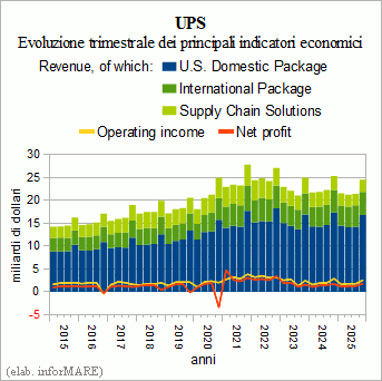 Nell'ultimo trimestre del 2025 i ricavi del gruppo logistico statunitense UPS sono diminuiti del -3,2% sullo stesso periodo dell'anno precedente essendo stati pari a 24,5 miliardi di dollari, di cui 16,8 miliardi generati dalle consegne espresso negli Stati Uniti (-3,2%), 5,0 miliardi dalle consegne espresso internazionali (+2,5%) e 2,7 miliardi dalle altre soluzioni per la supply chain (-12,7%). L'utile operativo si è attestato a 2,6 miliardi (-12,0%), con contribuiti pari a 1,4 miliardi dalle consegne espresso nazionali (-15,1%), 884 milioni dalle consegne espresso internazionali (-13,2%) e 263 milioni dalle altre attività logistiche (+16,4%). Il valore dell'utile netto è risultato pari a quasi 1,8 miliardi di dollari (+4,1%).