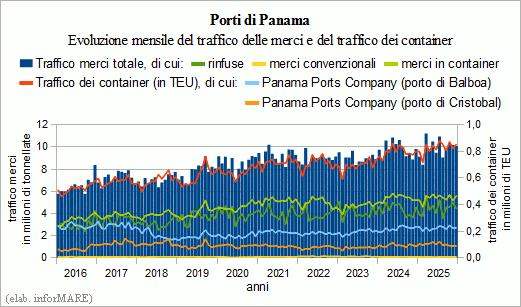 Par contre, les ports panaméens ont fermé en 2025 avec un un trafic de 118,9 millions de tonnes de marchandises, avec un légère augmentation de +0,7 % par rapport à l’année précédente, dont 53,6 millions Tonnes de vrac (+2,0 %), 770 mille tonnes de fret (-7,9 %) et 64,6 millions de tonnes de cargaison dans contenants (-0,2 %). Ce dernier flux de trafic, pris en compte dans les termes de caisses de 20 pieds traitées, équivalaient à 9 915 357 EVP (+3,6 %). Uniquement dans les ports de Balboa et Cristóbal exploité par la Panama Ports Company du groupe CK Hutchison Holdings Hong Kong, qui a vu la semaine dernière ses validité du contrat de concession par la Cour suprême de Panama Justice ( de 30 janvier 2026), le trafic conteneurisé était équivalent à respectivement à 2 676 768 EVP (+1,8 %) et 1 210 528 EVP (+9,4 %).