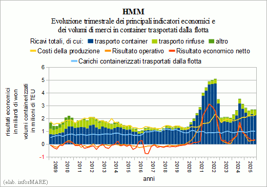 Nell'intero esercizio annuale 2025 i ricavi della HMM si sono attestati a 10.891,4 miliardi di won, in calo del -6,9% sull'esercizio precedente. Nel solo segmento dei container i ricavi sono stati pari a 9.243,4 miliardi (-8,9%) a fronte di volumi di merci in container trasportate dalla flotta pari a 3,94 milioni di teu (+3,2%) e a fronte di un valore medio dei noli che è stato pari a 1.214 dollari/teu (-24,4%). I ricavi generati dal trasporto di rinfuse secche hanno totalizzato 819,0 miliardi di won (+1,7%) e quelli prodotti dal trasporto di rinfuse liquide 628,0 miliardi (+18,0%). L'utile operativo è stato di 1.461,2 miliardi (-58,4%), con un contributo pari a 1.294,9 miliardi dal segmento dei container (-61,7%) e di 143,0 miliardi da quello delle rinfuse (+8,5%). L'utile netto è ammontato a 1.878,7 miliardi di won (-50,3%).