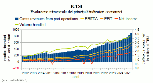 En 2025, el grupo de operadores de terminales filipinos International Container Terminal Services, Inc. (ICTSI) informó sobre el desempeño registros económicos y operativos anuales y trimestrales. En el año el tráfico de contenedores gestionado por los terminales del Grupo superó los 14 millones de TEUs por primera vez, subiendo a 14,5 millones de TEUs, con un aumento del +11,0% respecto a 2024 y con nuevos picos históricos en volúmenes gestionados en Asia, equivalentes a más de 7,7 millones de TEUs (+8,8%), y en las Américas, casi 4,2 millones de TEUs (+18,9%), mientras que el tráfico gestionado en Europa, Medio Oriente y África, que ascendió a 2,6 millones de TEUs (+6,1%), fue un resultado solo inferior al volumen total de 2021 y 2022.