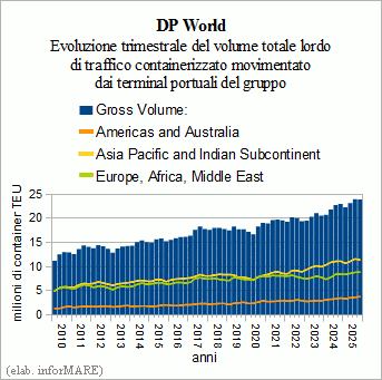 Solo en el cuarto trimestre de 2025, el tráfico total fue 23,9 millones de TEUs, un volumen que es el mayor alto para esta época del año y representa una Un aumento del +4,2% respecto al mismo periodo del año anterior. Se establecieron nuevos récords históricos en ese cuarto en relación con el tráfico gestionado en América y Australia y en Europa, Oriente Medio y África, que eran iguales respectivamente, a 3,7 millones de TEUs (+8,3%) y 8,8 millones de TEUs (+5,1%), mientras que en Asia y el Pacífico se manejaron el 11,4% millones de TEUs (+2,3%), un volumen que es el segundo más grande Tan alto como siempre.
