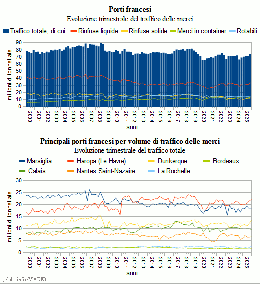 Nel quarto trimestre del 2025 i porti francesi hanno movimentato complessivamente 74,2 milioni di tonnellate di merci, con una progressione del +7,2% sullo stesso periodo dell'anno precedente trainata dall'aumento del +15,9% dei volumi di carichi all'imbarco attestatisi a 26,2 milioni di tonnellate, mentre le merci allo sbarco, con 48,0 milioni di tonnellate, hanno registrato una crescita più attenuata de +2,9%. Inoltre, l'incremento globale del traffico è stato generato dai rialzi dei volumi sia di merci containerizzate che sono ammontate a 13,3 milioni di tonnellate (+6,5%), con una movimentazione di contenitori pari ad oltre 1,4 milioni di teu (+3,4%), sia di rinfuse liquide e solide, pari rispettivamente a 33,7 milioni di tonnellate (+5,6%) e 12,0 milioni di tonnellate (+26,6%). I rotabili, con 14,1 milioni di tonnellate, hanno accusato una flessione del -1,7%.