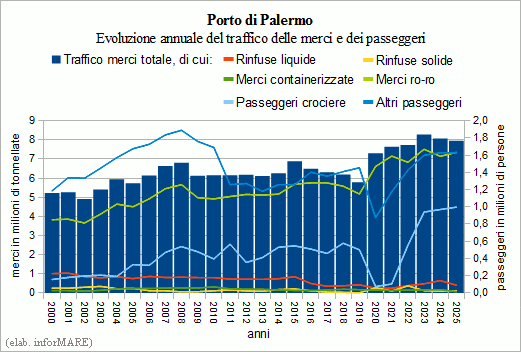 Nell'intero 2025 il porto di Palermo ha movimentato 7,95 milioni di tonnellate di merci, con una flessione del -1,5% sull'anno precedente, di cui 4,95 milioni di tonnellate allo sbarco (-4,3%) e 3,00 milioni di tonnellate all'imbarco (+3,5%). Il traffico totale dei rotabili è stato di 7,35 milioni di tonnellate (+2,9%). Le merci containerizzate sono state 68mila tonnellate (-61,7%). Le rinfuse liquide, in gran parte costituite da prodotti petroliferi raffinati, si sono attestate a 407mila tonnellate (-37,3%) e quelle solide a 129mila tonnellate (+22,9%).