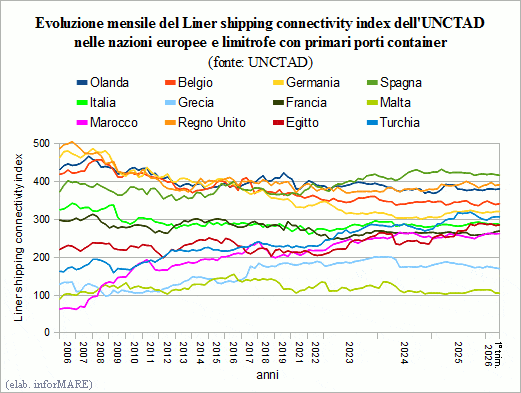 En el primer trimestre de este año el índice de conexión de Italia y sus puertos a la red de líneas marinas del mundo que transportan contenedores registró un ligero aumento de los +0,4% en el mismo período de 2025 siendo su Índice de Conectividad de Transporte Liner (LSCI), el índice definido de la Conferencia de las Naciones Unidas sobre Comercio y Desarrollo (UNCTAD), par a 288,3, figura que tiene como referencia el valor promedio de 100 de las naciones vecinas, 78% Alemania ha marcado el aumento, en cambio, es Egipto con un índice LSCI de 286,3 (+9,0%) seguido de Dinamarca con 93,2 (+8,1%), Suecia con 124,0 (+6,4%), Malta con 108,4 (+3,8%), Portugal con 184,0 (+3,5%), Turquía con 307,1 (+3,3%), Croacia con 63,2 (+3,3%).