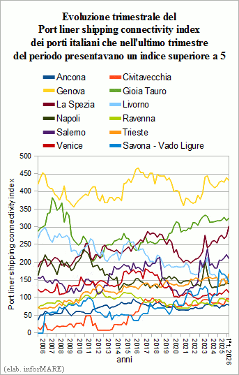 En relación con el grado de conexión de los puertos italianos más conectados a la red mundial de los servicios marítimos containerizzatos, que se evalúa desde el Índice de Conectividad Port Liner (PLSCI) de la UNCTAD, se obtienen resultados en aumento para los primeros siete puertos del ranking a partir del puerto de Génova con un índice PLSCI de 432,1 (+1,0%) seguido de los puertos de Gioia Tauro disminuir con 34%, Siga los puertos de Venecia con 115,4 (+1,4%), Civitavecchia con 96,9 (+12,9%), Ravenna con 90,0 (-7,9%), Ancona con 80,1 (+12,3%) y Cagliari con 32,5 (+24,7%).