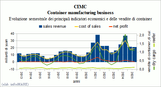 Im erst zweiten Semester des Jahres 2025 hat der Verkauf von Containern 1,2 million von teu gesamt, mit einer Reduktion von -43.3% auf den gleichen Zeitraum des Vorjahres, von denen 1,1 million von teu von trockenen Box (-46.4%) und 116mila teu von Containern Kühlschrank (+23.7%). Im Semester sind die Einnahmen aus dem Segment des Containers gleich zu 21,3 Milliarden Yuan gewesen (-42.9%) und das Segment hat einen Gewinn deutlich von 438 Millionen Yuan (-84,4%).