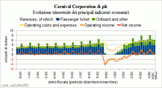Dans le premier trimestre de l'exercice financier 2026, période qu'il est conclu le 28 février dernier, les revenus du groupe crocieristico American Carnival Corporation ont enregistré un accroissement du +6,1% sur la même période de l'exercise précédent étant monté à 6,16 milliardes d'euro, valeur qui est le plus élevé toujours pour cette période de l'exercice financier et a été atteint grâce aux nouveaux records pour ce trimestre est des ventes totales de croisières Dans le trimestre de décembre 2025 - février 2026, les coûts d'exploitation du groupe ont crû de +5,5% allant jusqu'à 5,56 milliards, accroissement qui a été généré de l'augmentation de tous les éléments de dépense sauf que pour l'achat des carburants qui, avec 397 millions de dollars, a montré une diminution de -14,6%. Dans le trimestre le coût du carburant par tonne consommé est le résultat de 559 dollars (- 13,1%).