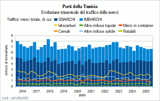 Im letzten Quartal von 2025 haben die tunesischen Häfen 6,67 million von den Tonnen von den Waren bewogen, mit einem Rückgang von -8,5% auf der Korrespondenten Periode des Vorjahres von der Verringerung von beiden Waren auf die Ausschiffung als die von dem Boarding bestätigt 4,55 million von den Tonnen (- 2,1%) und 2,12 million von den Tonnen (- 19.8%). Die Biegung ist hauptsächlich aus der Kontraktion der Volumen von flüssigem Schüttgut hergestellt worden, mit den Kohlenwasserstoffen, die zu 1,74 Millionen Tonnen betragen (-10,4%) und die anderen flüssigen Ladungen zu 170 Tausend Tonnen (-19,2%). Im Rückgang auch der Verkehr des Getreides, das 834mila Tonnen erreicht hat (-41.3%), während die andere feste Masse, mit 1,63mila Tonnen, eine Zunahme von +5.1% registriert. Der Verkehr der Waren mehrere ist von 2,29 million von Tonnen gewesen (+6.1%), von denen 1,16 million von den Tonnen von den Waren (+5.5%) mit einem Handling von den Containern von den gleichen zu 152mila teu (+12.2%), 615mila Tonnen von den Rotabili (+14.9%) und 517mila Tonnen von anderen Waren verschiedene (-) 1,6%). Der Verkehr von Autos ist von 106 Tausend Fahrzeuge gewesen (+67.3%). Im Segment der Passagiere war der crocieristico Verkehr von 77mila (+11.7%) und von den Dienstleistungen von der Linie von 138mila (+3.7%).